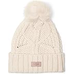 - Stay warm in style wearing the UGG® Cable Beanie With Pom! This cozy essential features a chic, cable-knit design topped with a playful, fuzzy pom-pom for added flair. Made with a snug, fitted shape and crafted to pull on easily, it's the perfect blend of function and fashion. The genuine leather UGG license plate logo adds a signature touch, giving you a timeless cold accessory that pairs effortlessly with any cold-weather look.